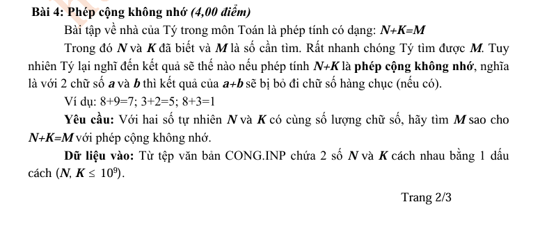 [TS10 Khánh Hòa 2018 - 2019] Phép cộng không nhớ